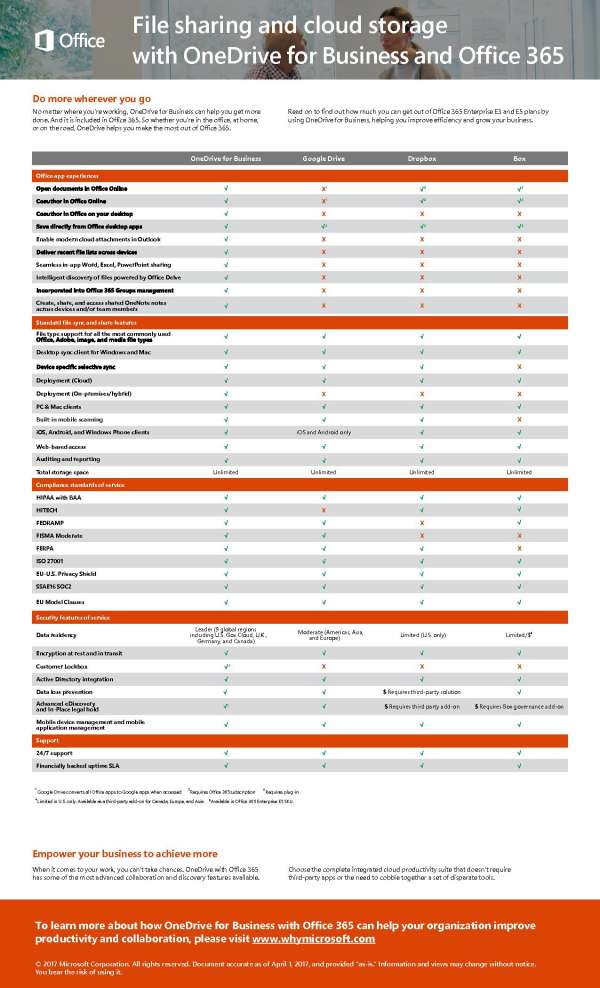 OneDrive for Business, included in Office 365, offers more of what you need to improve efficiency and grow your business. With best-in-class apps and integrations, security, and support, OneDrive for Business is one more reason to choose Office 365, the complete, integrated cloud productivity suite.