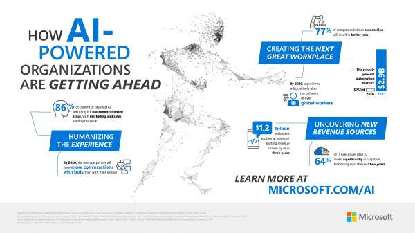 This infographic illustrates how powered AI organizations are getting ahead by humanizing the experience, creating the next great workplace, and uncovering new revenue sources.