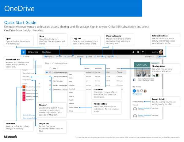 This Quick Start Guide four-page infographic will show you how to do more wherever you are with secure access, sharing, and file storage. Sign in to your Office 365 subscription and select OneDrive from the App launcher.