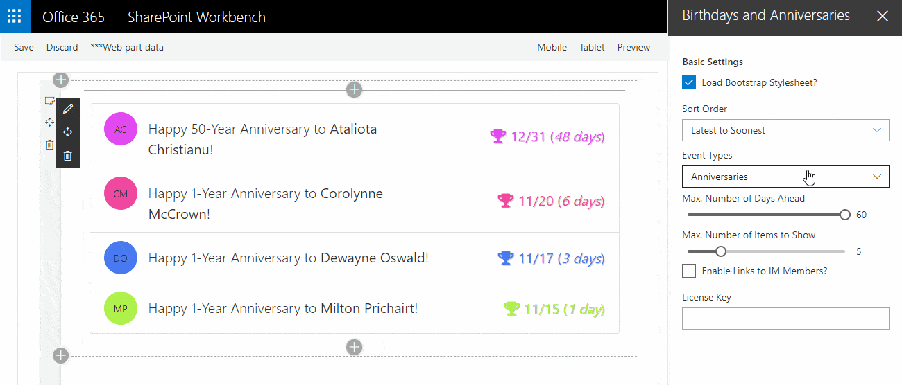 This web part uses data from Azure Active Directory to display users’ upcoming birthdays or work anniversaries!