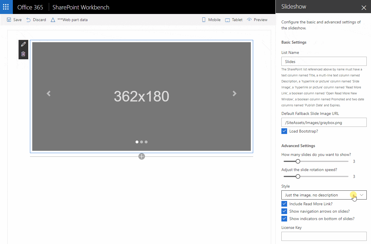 - How many Slides do you want to show? This determines how many images will appear in the carousel from the SharePoint list. The App Part will pull the first ten items from the list.