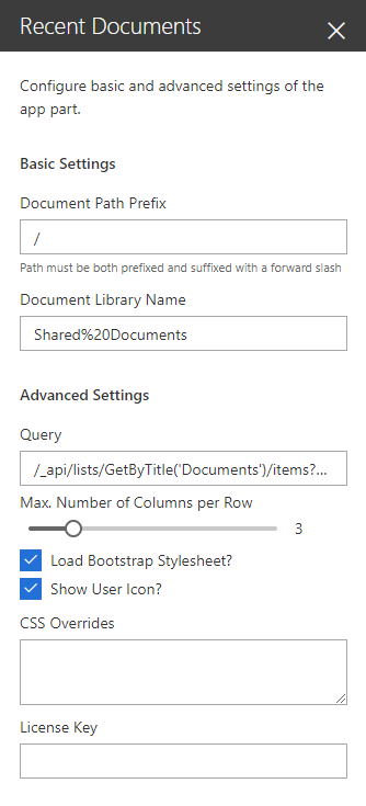Recent Documents Web Part Recent Documents web part can display a formatted view of all documents in a document library and uses native SharePoint services to generate a thumbnail when a supported file type is available. Basic properties such as the document list name and number of columns can be configured, as well as advanced settings such as the API querystring and CSS overrides!