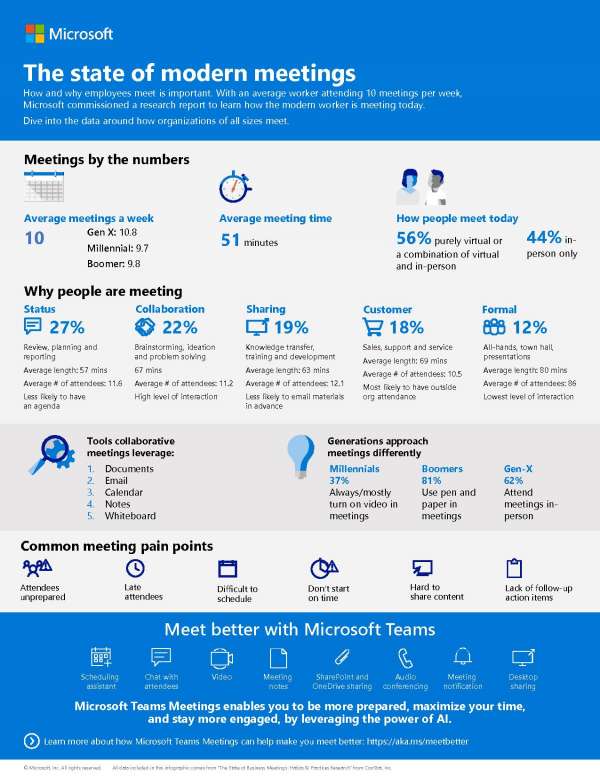 This infographic describes the importance of how and why employees meet. With an average worker attending 10 meetings per week, Microsoft commissioned a research report to learn how the modern worker is meeting today. The data covers organizations of all sizes.