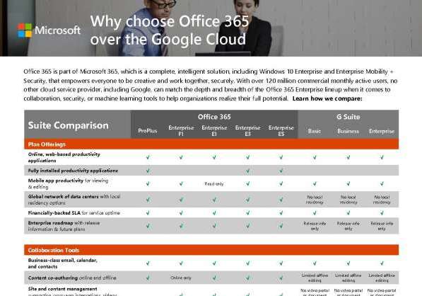 At Avvenire Solutions, we know you need a substantial enterprise lineup when it comes to collaboration, security, and machine learning tools so your organization can realize its full potential. Office 365, part of Microsoft 365, is a complete solution, empowering creativity and collaboration. No other cloud service provider, including Google, can match the depth and breadth of Office 365. Learn how they pair up in this comparison tool and contact us to find out more.